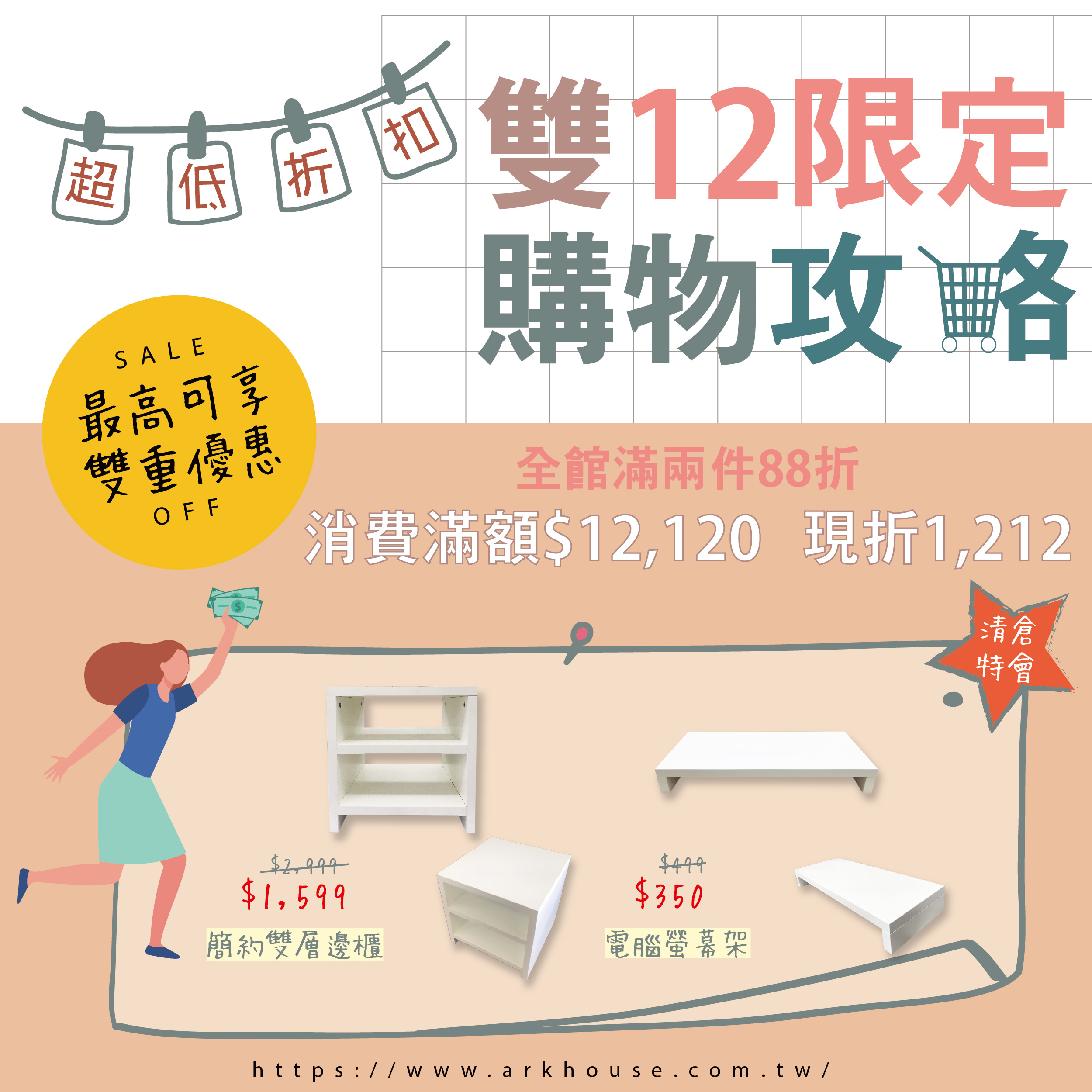 儘管買不到兩件,只要有滿額一樣享優惠 給你成雙成對,滿滿回饋 完全是前所未有的超低折扣阿~~~ 趁現在清空你的購物車吧!