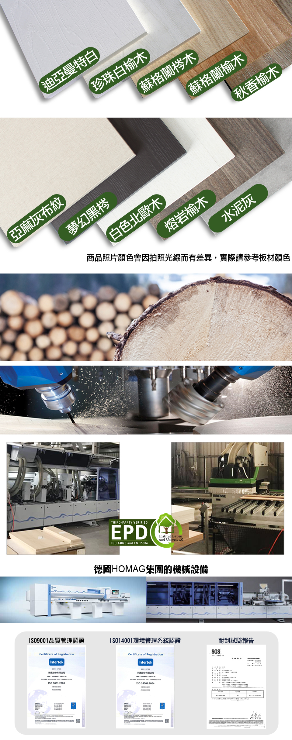 | 保養說明: | 塑合板材質為F1(F★★★★)等級之低甲醛材料,符合CNS2215、CNS11668標準規範之高品質美耐皿板料表面耐刮永保如新,對一般家具清潔劑、溶劑等具極佳抗性,一般清潔時使用乾布或稍微沾水的濕布即可,如有較髒汙漬時可用家具清潔劑或溶劑輕易擦拭乾淨。 | ||